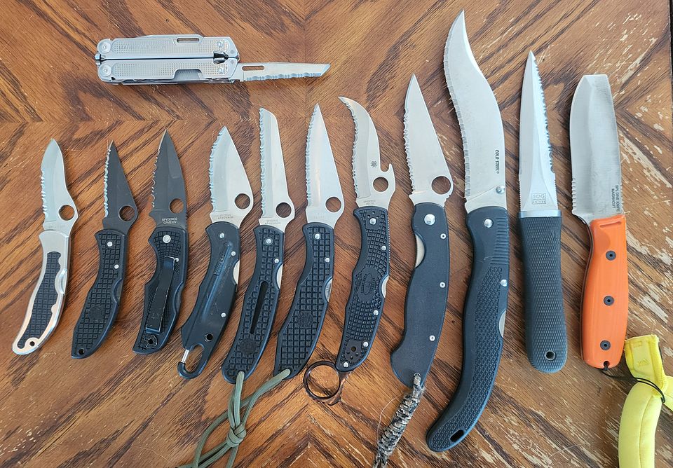 So, I just grabbed some serrated knives I've had over the years; most are folders, most recent is a "dive knife" with a partially serrated edge I used in the FL Keys a couple weeks ago. If I think I need serrated, I prefer a second knife that is fully serrated. Some multitools are perfect as that's the blade that gets the abusive use, saving your plain edge for more appropriate tasks. I'm not a mariner at all, but if you're cutting a lot of thick rope (especially wet nylon), your plain edge is going to dull quickly...do you have time to touch up or sharpen, or do you just want to use that serrated edge to get the job done?